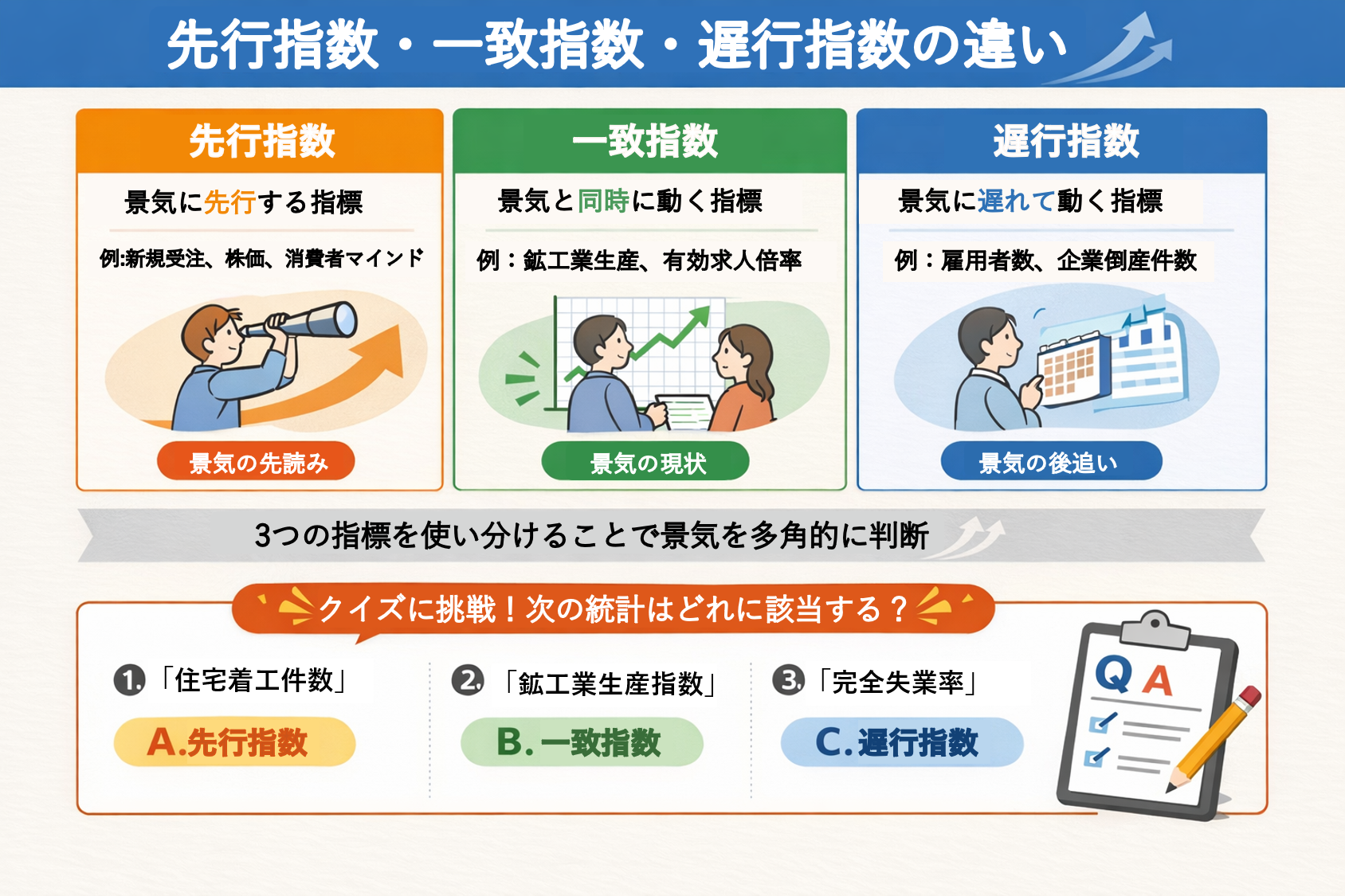**答え:A. 先行指数** 将来の業績期待や金利見通しを織り込むため、実体経済に先行しやすい指標です。おわりに|統計は「役割」で見る