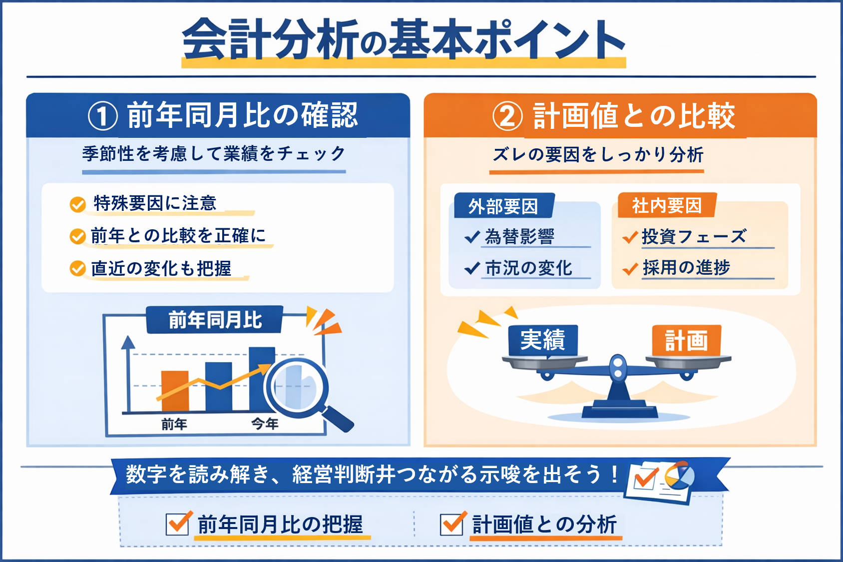 経理が自社の会計分析を行う際に最低限押さえるべき「前年同月比」と「計画比」の考え方について、実務視点で整理します。
